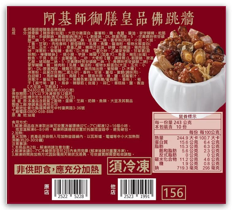 成分:排骨酥【豬排骨(台灣)、大豆分離蛋白、蕃薯粉、糖、食鹽、醬油、麥芽糊精、乾酪素鈉、多磷酸鈉、焦磷酸鈉(無水)、L-麩酸鈉、DL胺基丙酸、5ˊ-次黃嘌呤核苷磷酸二鈉、5ˊ-烏嘌呤核苷磷酸二鈉、琥珀酸二鈉、香辛料(肉桂、小茴、大茴、丁香、甘草)、肉桂香料[酵母精粉、乳糖、食鹽、醬油粉、植物水解蛋白(大豆、玉米、小麥)〕、胺基乙酸、精緻芥花油、砂糖、棕櫚油、豬肉抽出物、洋蔥粉、葡萄糖、香料、D-木醣、二氧化矽、乙基麥芽醇、甘草素(甜味劑)、檸檬酸鈉】、翅小腿、芋頭、豬腳丁(台灣)、鳥蛋、豬肚(台灣)、鮑魚、干貝、魚皮、金蘭醬油、二砂、大骨粉【鹽、調味劑 (L-麩酸鈉、胺基乙酸、琥珀酸二鈉、5´-次黃嘌呤核苷磷酸二鈉、5´-鳥嘌呤核苷磷酸二鈉)、麥芽糊精、糖、豬肉粉〔乳糖、醬油粉、植物水解蛋白(大豆、玉米、小麥)、DL-胺基丙酸、精製芥花油、豬肉抽出物、葡萄糖、D-木糖〕、洋蔥粉、品質改良劑(二氧化矽)、香料、甘草、薑母、當歸(調味用)、白胡椒】、馬鈴薯澱粉、烏醋、筍干【麻竹筍、鹽】、烏參、豬腳筋(台灣)、蒜仁、香菇絲、鹽、香油【芝麻油、大豆油】。